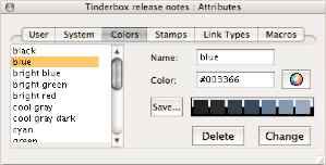 Named colors are always the preferred way to set and change colors in Tinderbox. Named colors may be redefined, and new named colors added or deleted, in the Colors pane of the Attributes window (Cmd-2)