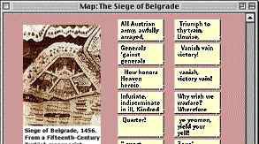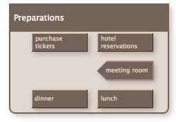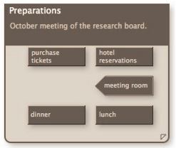 A map view also shows many of the links between notes. If both the source and destination of the link are in the map, the link is drawn as a curving arrow between the boxes, with the link name at the midpoint of the arrow. If the source or the destination of the link is outside the map, the link is drawn as a short arrow departing from or arriving at a box.
